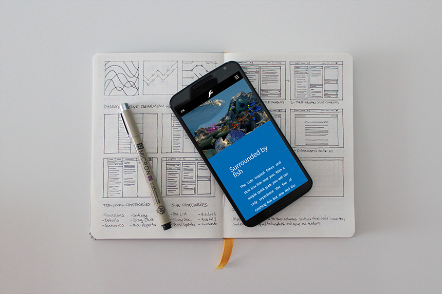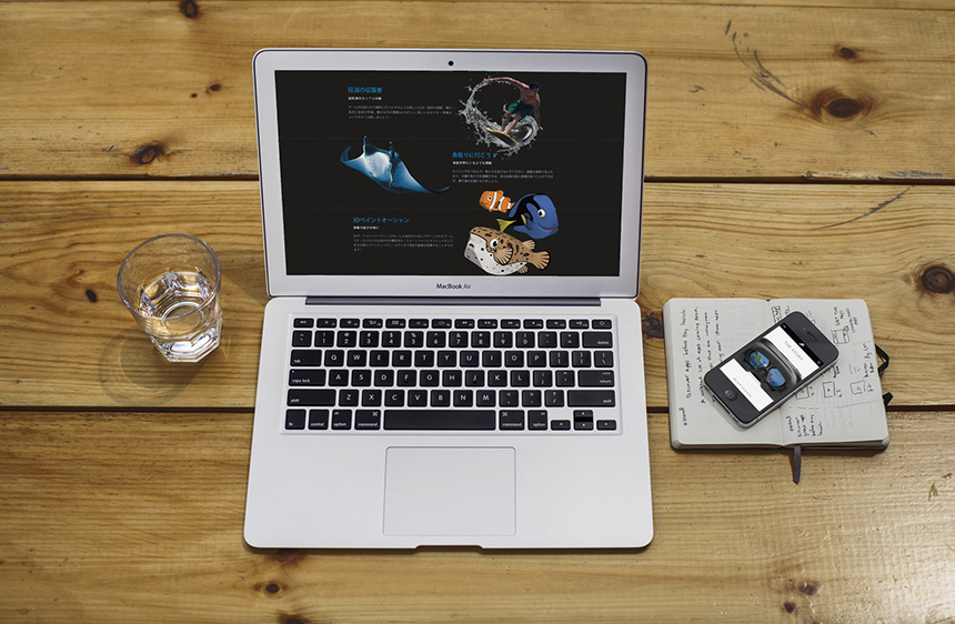 既然是VR技術,我們相信畫面會自己說話,於是設計上做出由影片主導的概念,在首頁、遊戲介紹頁面,讓來訪的人自行感受畫面所帶給他的訊息。色系上及品牌概念圍繞著海洋,底圖多數使用海洋概念的視覺呈現,右側滾動的卷軸加了一台潛水艇,隨使用者捲動轉換為下潛的深度,是個極為有趣的小巧思,讓海洋元素充滿整個網站。